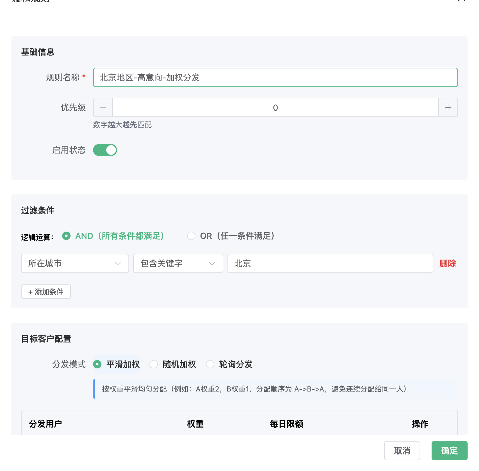 - 规则名称:请起一个易于识别的名字,如“北京地区-高意向-加权分发”。