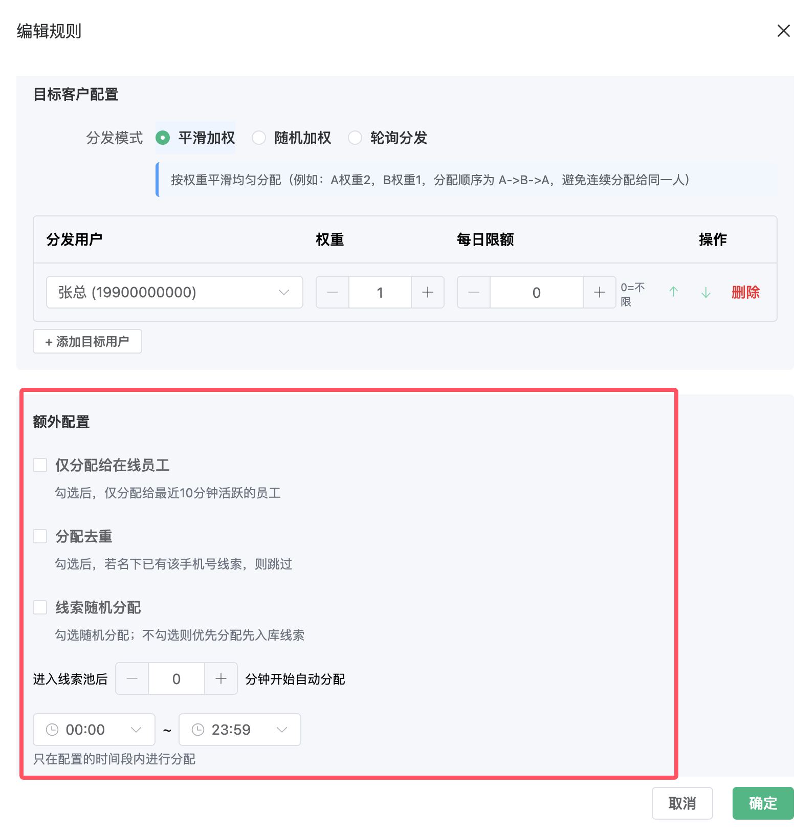 - 每日限额:该员工当天接收线索的上限(0 表示不限量)。一旦达到上限,该规则将自动跳过此人,直至次日重置。
