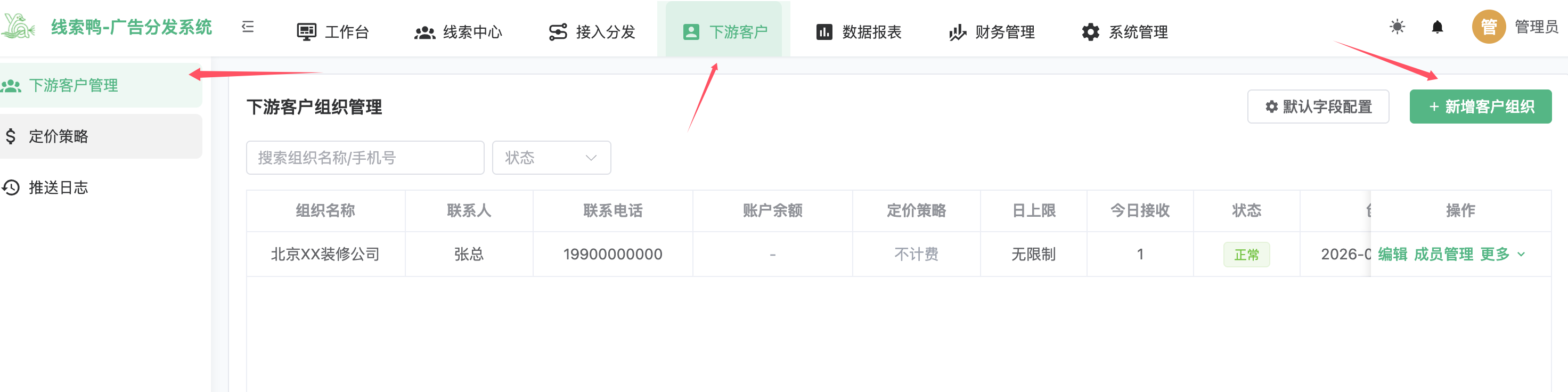 在【下游客户管理】菜单中点击【新建客户】,填写以下核心信息: