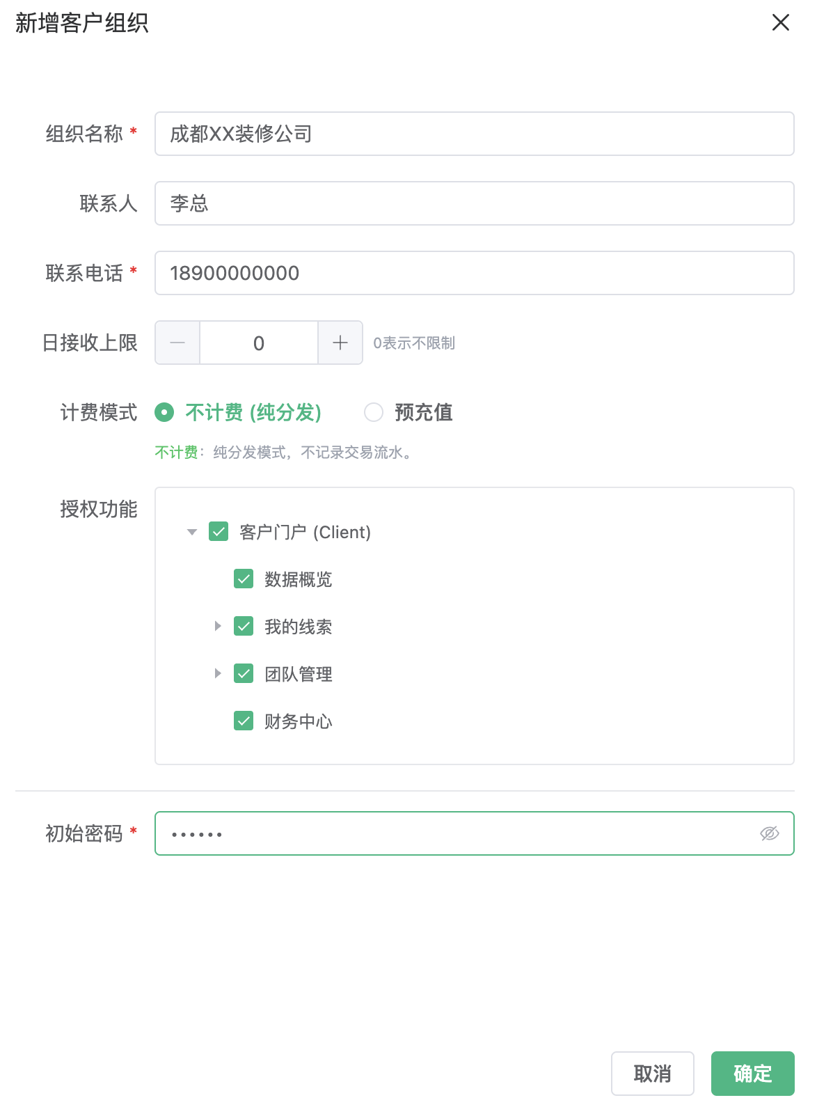 - 不计费:分发线索不产生费用扣除,常用于内部分公司。