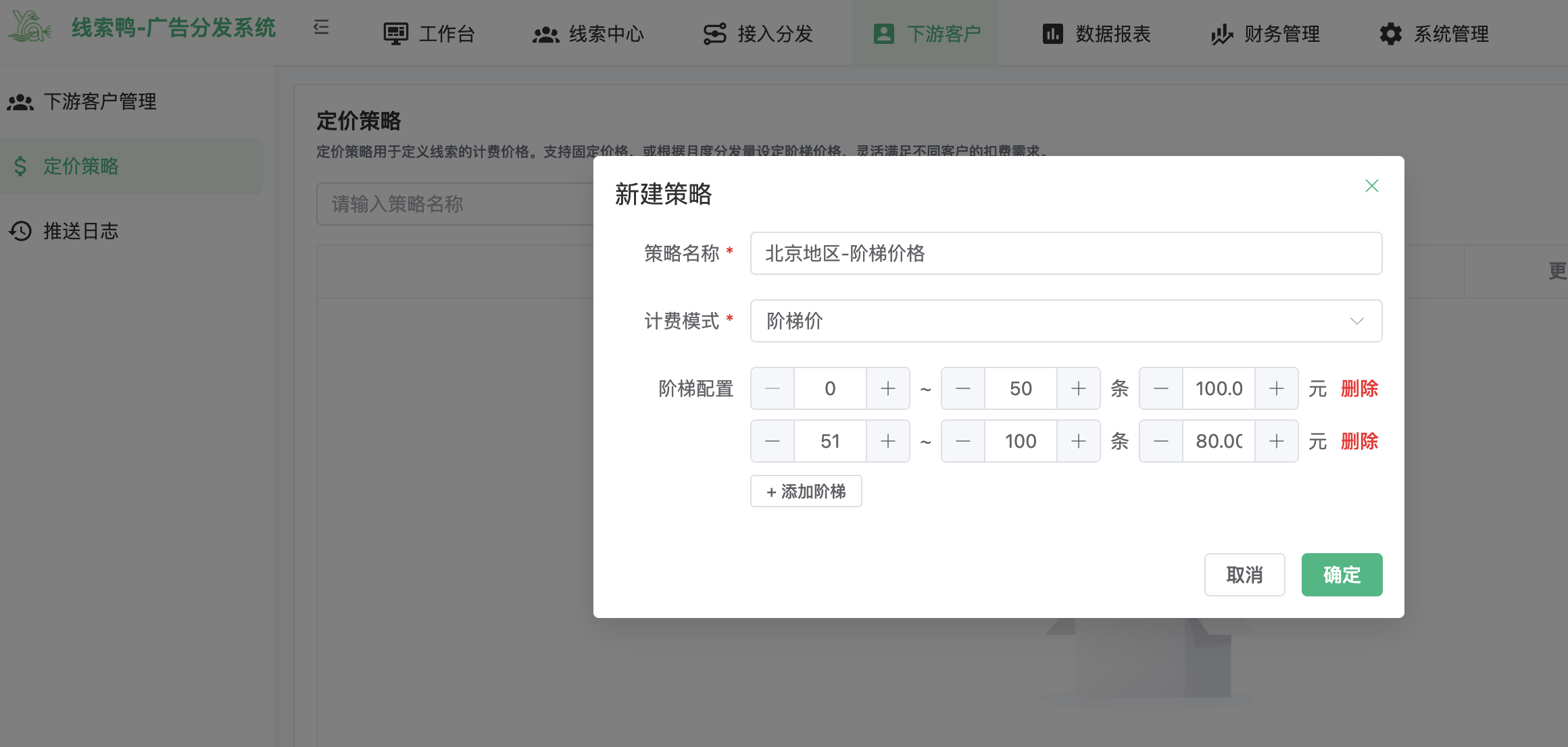 财务结算是线索鸭的核心变现引擎,支持灵活的价格配置和自动扣费逻辑。