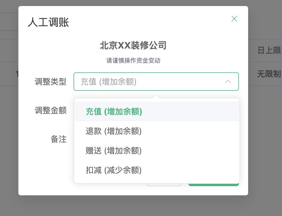 除了线索扣费和充值,管理员支持多种调账类型: