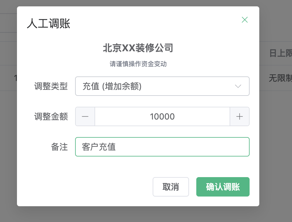 - 实时充值:手动录入充值金额(例如客户线下对公转账后,管理员进行线上加款)。